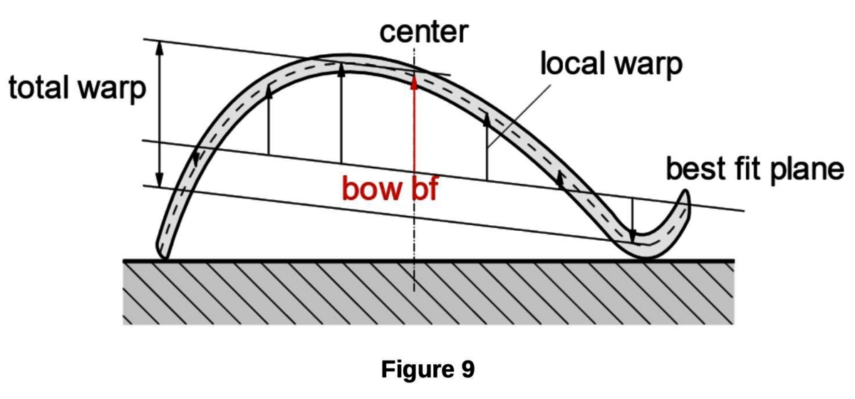 在这种情况下,翘曲度远远大于厚度和 TTV。这就是为什么我们在计算晶片特性 "翘曲度 "时,使用晶片的下表面、上表面(梭里)或中线(翘曲度)并不重要的原因。